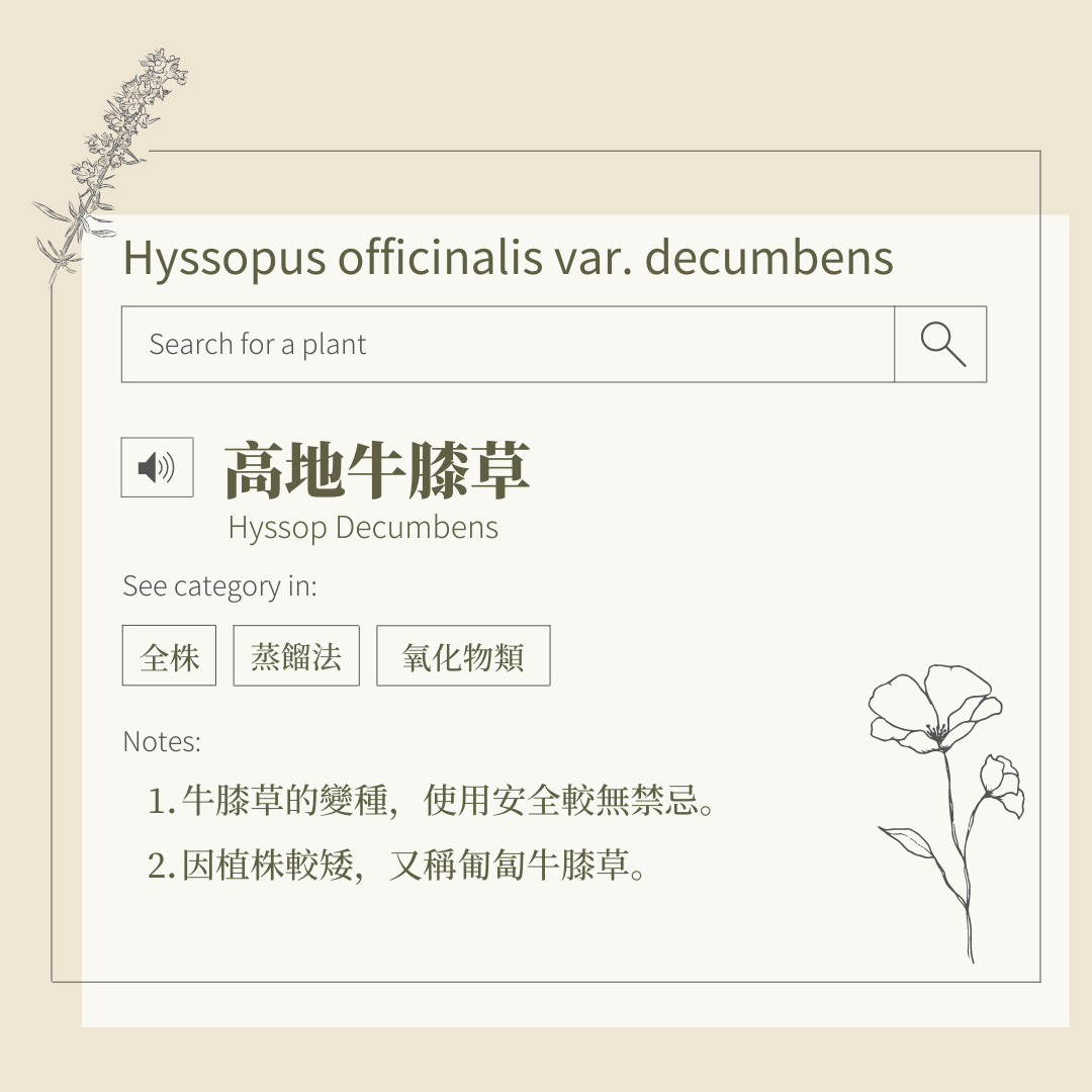 不過它的變種「高地牛膝草」由於生長環境不同,因此植物體內會分化出比較不一樣的成分,除了牛膝草原有的酮類分子以外,更高比例是以氧化物「1,8-桉油醇」和「沈香醇氧化物」所組成,所以危險性大幅降低,是連幼兒都可以放心使用的一款精油。